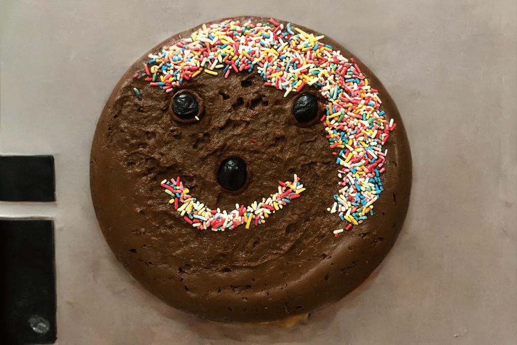 - Decore com confeitos coloridos para fazer os cabelos e confeitos pretos ou coloridos para fazer a boca.